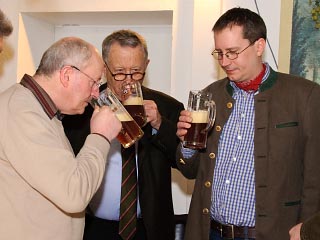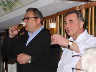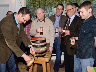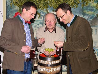 Dazu zählten gestiftete Fäßchen Storchenbier der Steinbach-Brauerei. Es fließt als die beliebteste Sorte bei Steinbach aus dem Zapfhahn, wie Braumeister Roman Gause verriet, der von Seniorchef Dieter Gewalt und Juniorchef Christof Gewalt unterstützt wurde.