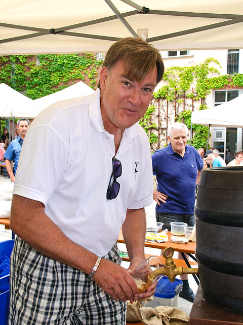 Aus bierkultureller Sicht war eine obergärige Neukreation der eindeutige Höhepunkt des Festes: das Steinbach-Altstadtweizen. Herrlich fruchtig und süffig, geschmacklich deutlich in die Richtungen Citrus und Pfirsich gehend, ist es genau das Richtige für warme Sommerabende und begeisterte nicht nur viele Kirchenplatzbesucher, sondern auch seine eigenen Schöpfer im Brauteam um Braumeister Christoph Gewalt und Roman Gause. Aufwändig im Zweimaischverfahren mit einem Quantum Dunkelmalz und den Edelhopfensorten Smaragd und Opal hergestellt, erreicht es bei einem Stammwürzegehalt von 13,4 % etwa 5,2 % vol. Alkohol. Die fruchtige Flüssigleckerei fand auf Anhieb ihre Fans, sodass der gesamte Sud – was nicht wirklich verwunderte – bereits nach einer Woche weggetrunken war …!