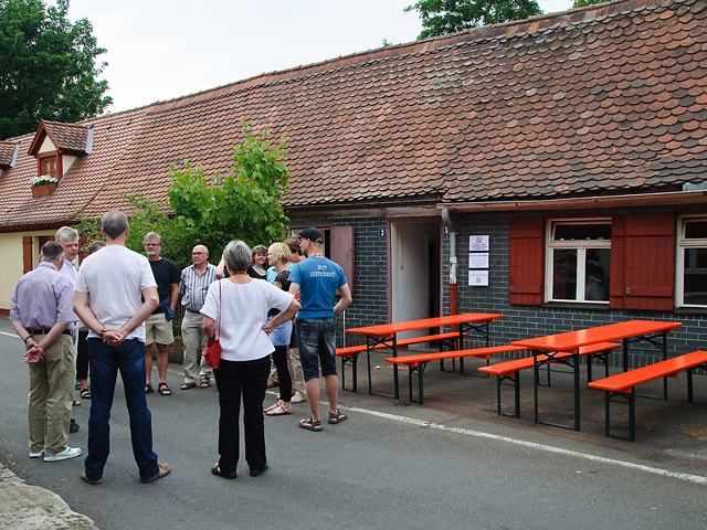 Am späten Abend wurde auch die 10-Jahres-Feier des VFFB vom hereinbrechenden Gewitter erfasst, welches dem zeitgleich stattfindenden Schlossgartenfest in Erlangen ein jähes Ende setzte. Doch für die hier verbliebenen Bierfans war ein geeigneter Schutzraum nahe, konnte man sich doch mit den Sitzgarnituren in den unteren Keller (früher von der Brauerei Schübel Baiersdorf genutzt) retten, wo es sich trotz der Kellerkühle neben der immer noch wohl gefüllten Fassbatterie aushalten ließ!