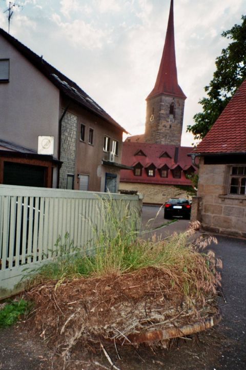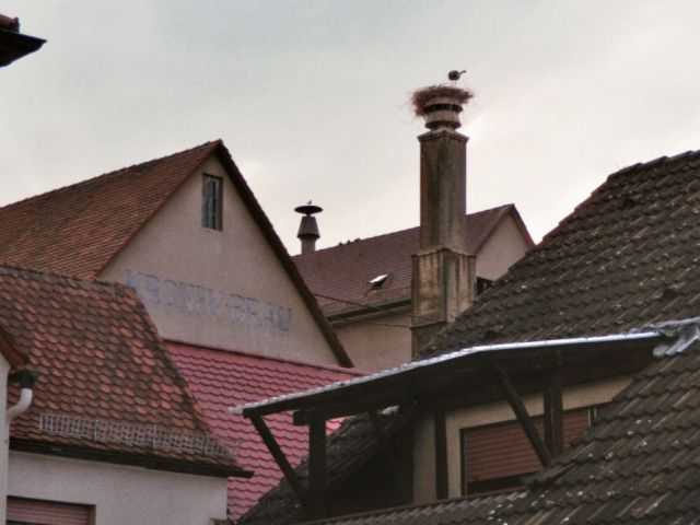 Auch das Ottensooser Storchenpaar verfolgte das Kirchweihtreiben mit Interesse, hatte es sich doch Anfang 2012 entschieden, weiter über dem Ort auf dem zentralen Brauereigelände „wohnhaft“ zu bleiben. Nachdem von einem der beiden großen Mälzereikamine im Herbst 2011 ein stattlicher Eisenring abgefallen war, mussten der rote Schornstein mit der charakteristischen Windhaube und der gelbe „Storchenschlot“, welcher bisher das Storchennest trug, aus Sicherheitsgründen abgerissen werden. Als Ersatzstandort boten die Ottensooser den Störchen (mit Unterstützung des Landesbundes für Vogelschutz) einen extra gezimmerten Dachreiter auf einer privaten Scheune direkt am Pegnitzgrund an. Doch diese zeigten nach ihrer Rückkehr im Frühjahr 2012 der neuen Horstunterlage „die kalte Schulter“ und bauten ihr Nest auf einem der übriggebliebenen Brauereischlote. Wie gesagt, von hier oben kann man Ottensoos hervorragend überblicken und hat das Kirchweihgeschehen zu seinen Füßen!