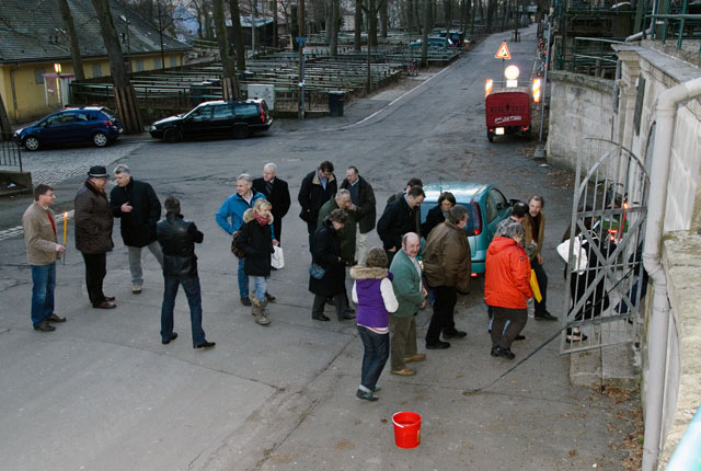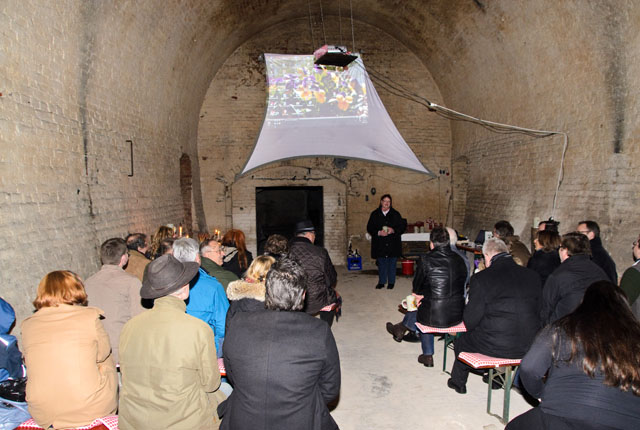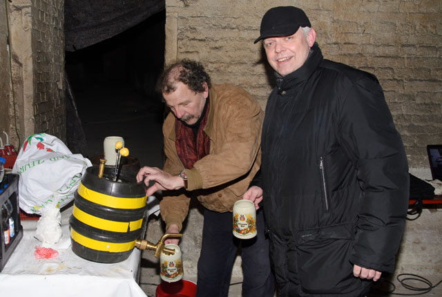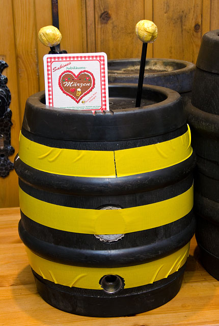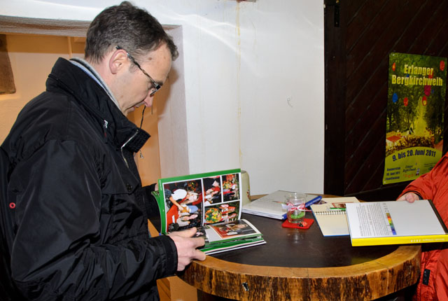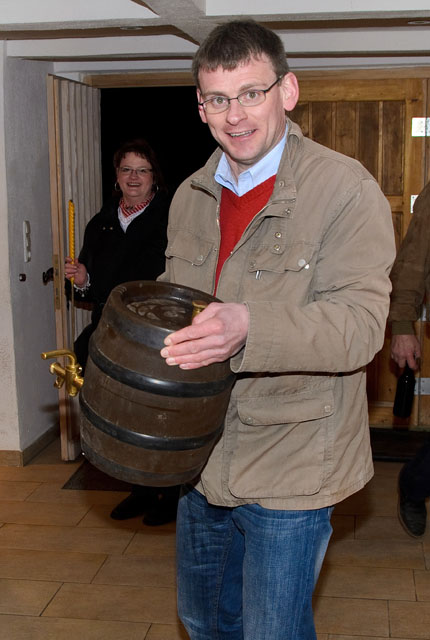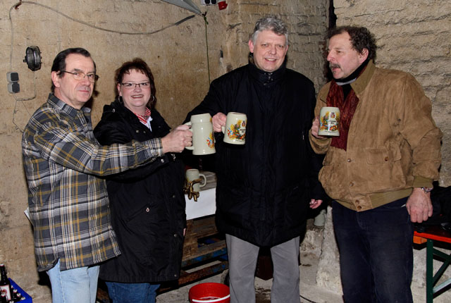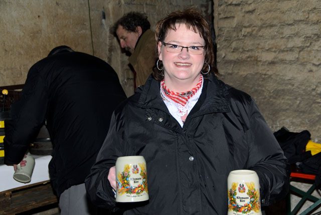 Am Freitag, 9. März 2012, lud unsere Fotografin Sabine Ismaier unter dem Motto „Bier braucht Liebe Bier zu werden. Bier braucht liebe Trinkgefährten“ aus Anlass ihres 10-Jährigen als „Bierstadtfotografin“ zu einer ganz besonderen Feier: „Mit selbstgebrautem Märzenbier möchte ich darauf anstoßen – es erwarten Euch schöne Fotomomente und fränkische Leckereien“. Treffpunkt war um 18.00 Uhr der Henninger Keller, den Fritz Engelhardt freundlicherweise zur Verfügung gestellt hatte. In der ersten der zwei großen Kavernen konnten die Gäste der Fotografin zunächst bei frisch Gezapftem und köstlich belegten Walnussbroten in einer einstündigen Beamershow die wichtigsten Erlanger Bierkulturmomente von 2002 bis 2012 bewundern. Ihr süffiges Märzen hatten Sabine Ismaier unter dem Label „Bienchen Bräu“ bereits am 16. Januar 2012 in den Kesseln von Georg Rottner (mit Unterstützung der „Profihobbybrauer“ Peter Ross und Kurt Maria Adler) in Erlangen-Kriegenbrunn aus einer ganz speziellen Klostermalz-Steinbach-Malz-Melange und Aromahopfen gebraut. Für das anschließende Gelingen sorgte Peter Kitzmanns untergärige Hefe.
