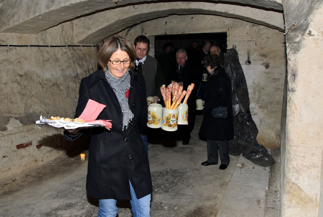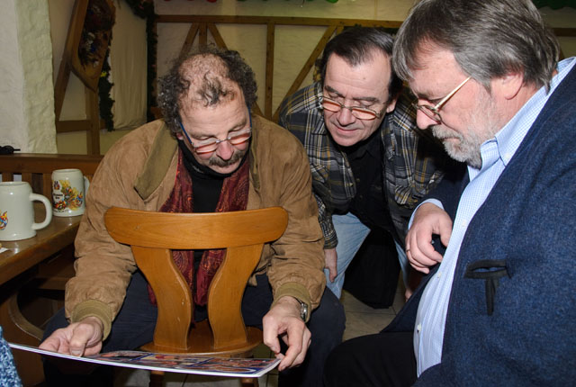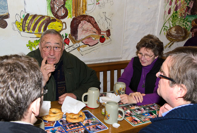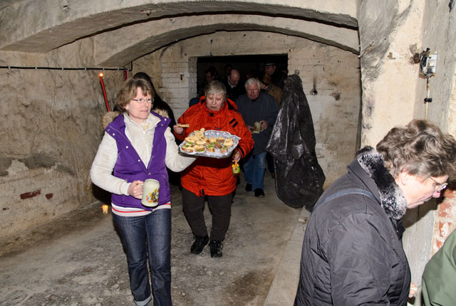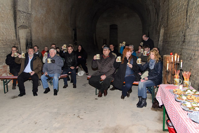 Zweite Station dieses schönen Abends war der Weller Keller, den die Eheleute Rosi und Heinz Müller extra für die Bierkultur-Fotografin „aufgeschlossen“ hatten. Hier fühlte sich die illustre Gästeschar (die ganze Erlanger Brauerszene war irgendwie vertreten) sichtlich wohl, wozu die vom Frauenauracher Restaurant Schaumlöffel gelieferten 3 Variationen der Rottnerschen Bratwürste das ihre taten. Gebraten mit Sauerkraut, als Blaue Zipfel oder als Curry-Zwiebelbratwürste (nach einem Berliner Rezept) – für alle Gaumen war etwas dabei. Dazu schmeckten kleine und große Guldenbrezen. Für einen süßen Abschluss sorgten zu guter Letzt die hausgemachten Bierpralinen der Gastgeberin. Auf die nächsten 10 Jahre „Fotomomente der Bierstadt Erlangen“ von und mit Sabine Ismaier!