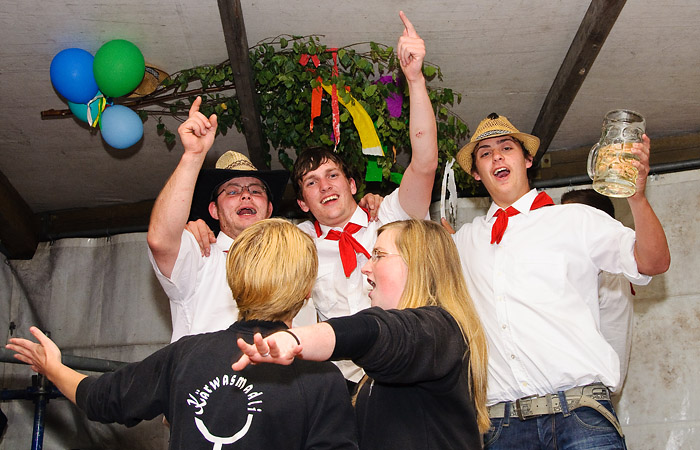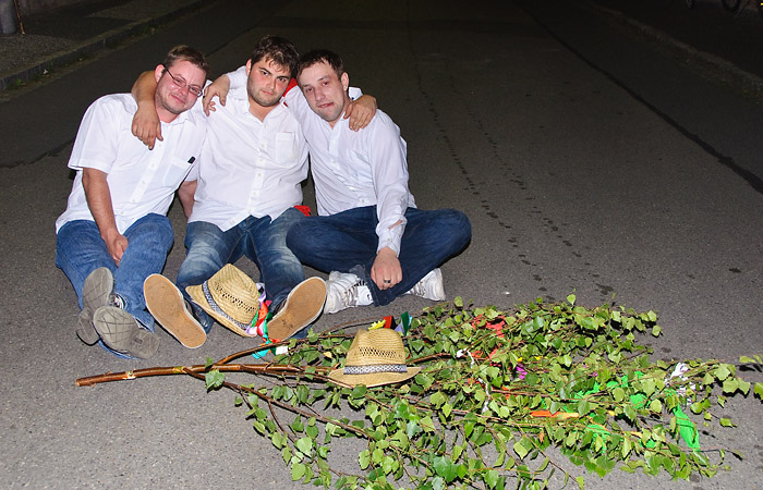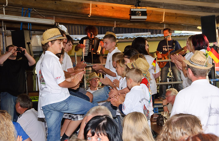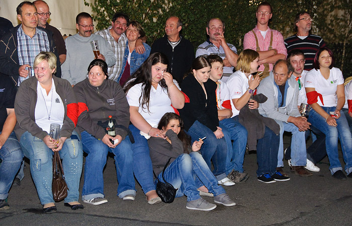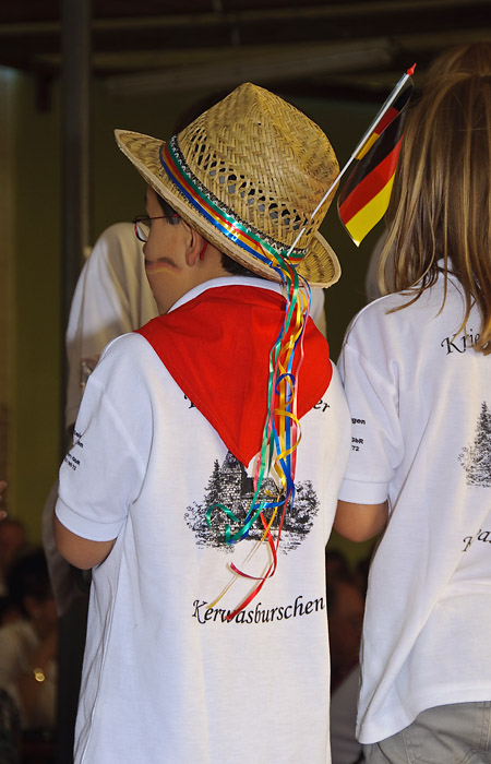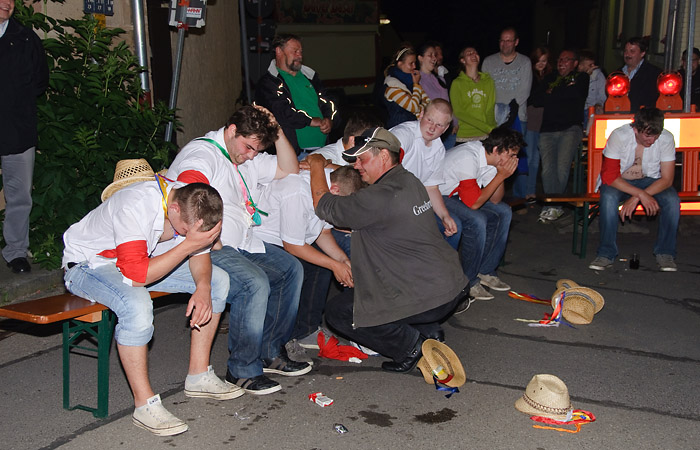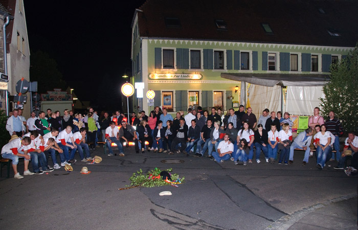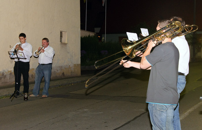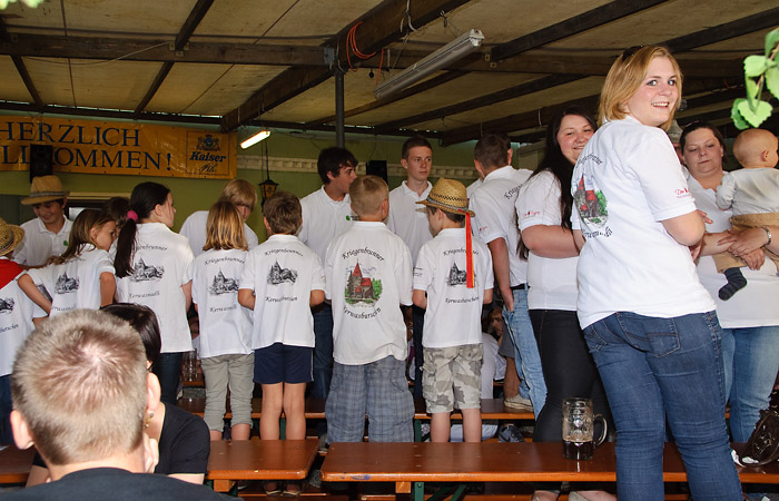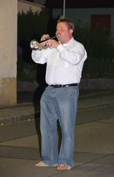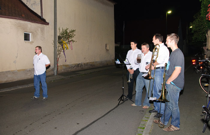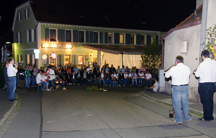 Das Ende der Kerwa am Montag, 25. Juni 2012, war wieder sehr herzergreifend – wird der Kehraus doch in einer wohl einmaligen Art zelebriert: Um Mitternacht folgen alle Besucher vier Kriegenbrunner Blechbläsern (die Seitzen-Buam hatten in den Stunden davor für Stimmung gesorgt) aus dem Wirtshaus bzw. dem Zeltgarten auf die Straße, wo die  Musiker zum sog. Morgensegen von zwei unterschiedlichen Positionen aus u.a. Lilly Marlen, das Abendlied und die vom Erich Keller ebenfalls bestens bekannte Liedversion „Blutwurst und Sauerkraut“ zum Besten geben. Derweil sitzen die Kerwasmadli und Kerwasburschen auf Bänken im Halbrund der Straße, um das Ende der Kirchweih zu beweinen. Jeder (aber auch jede und jeder) der hier Anwesenden wird von dieser traurigen Abschiedsatmosphäre berührt. Danach ist die Kriegenbrunner Kirchweih aus, die Wirtschaft und der Zeltgarten haben sich geleert und alle gehen gemächlichen Schrittes nach Hause. Wohl das anrührendste Kirchweihende in Erlangen!
