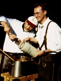 Nach den ersten 50 Litern Freibier schob Christoph Gewalt noch einmal ein 30-Liter-Fass nach, da das köstliche, im Zwei-Maisch-Verfahren produzierte Untergärige mit seinen 13,8 % Stammwürze und 6 % vol. alc. vollmundig und vielgelobt süffig „rüberkam“. Musikalisch umrahmt wurde das kleine Bierfest wie immer von Gonzos Dixie-Combo, zu deren Klängen die hungrigen Mägen der Besucher – auch schon traditionell – u.a. mit Sofie Steinbachs Biergulasch beglückt wurden.